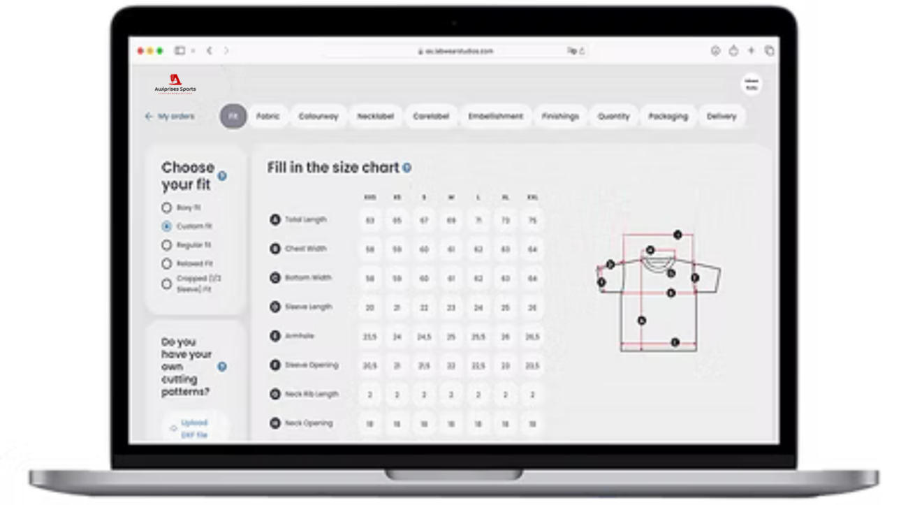 Select your custom measurements, fabrics, colors, labels, and use Illustrator for embellishment, including reference images for finishings.