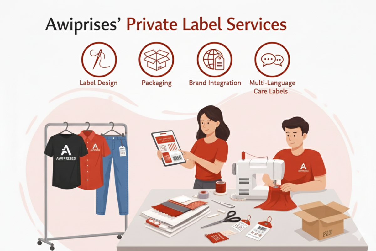 Awiprises offers complete private label solutions to help brands build a strong and consistent identity. Our services include custom branding, label design and production, hang tags, packaging, and multi-language care labels. Every detail is carefully integrated to reflect your brand’s identity across all products.