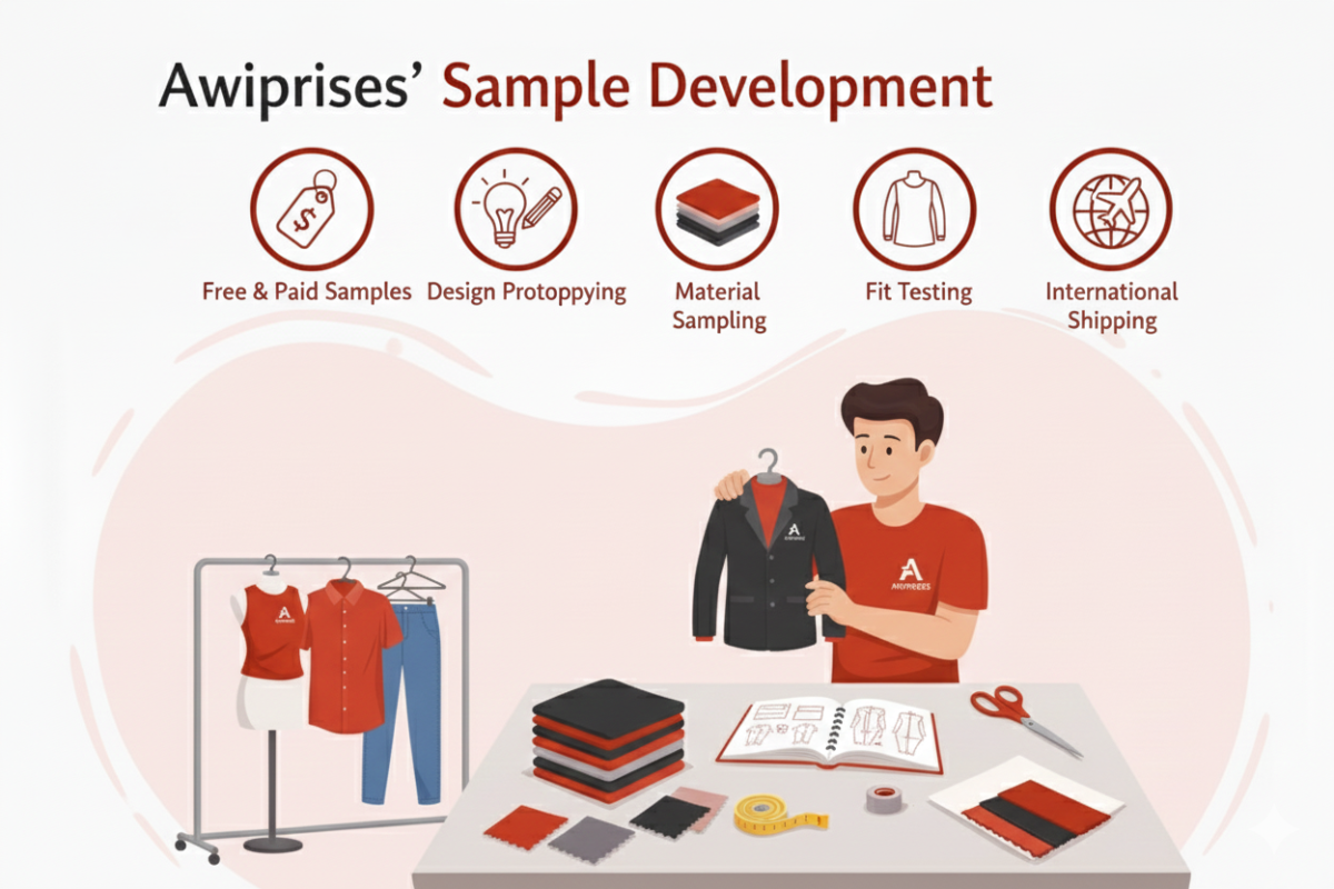 Awiprises provides professional sample development services to ensure your designs are perfected before bulk production. We offer free and paid sample options, including design prototyping, material sampling, and fit testing. Samples can be shipped internationally to support brands worldwide.